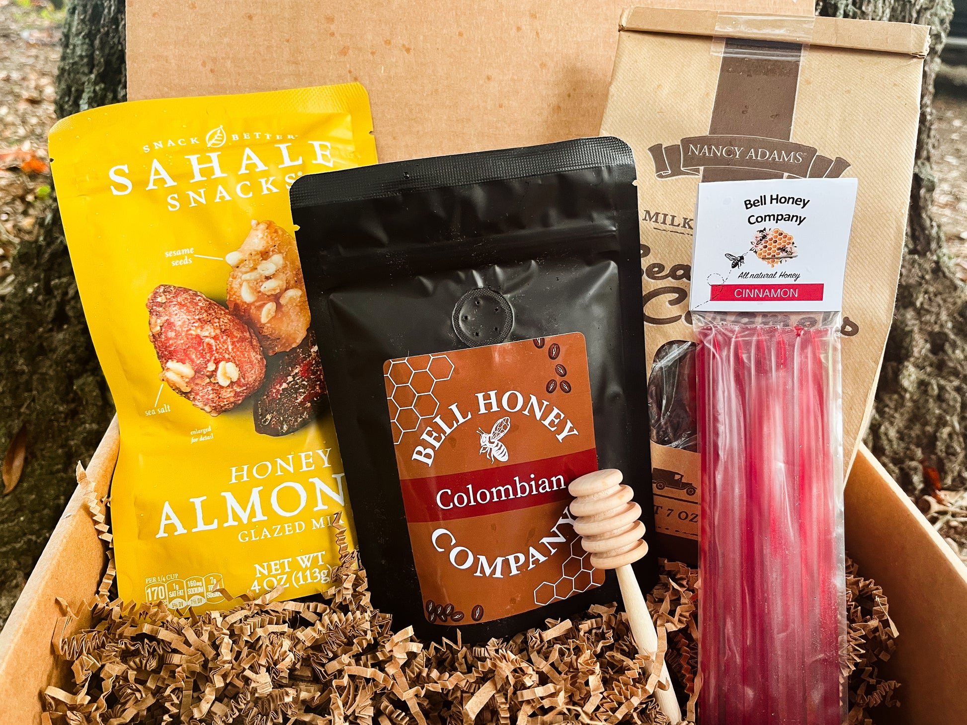 Indulge in a carefully curated assortment of warm, rich flavors with our Bourbon Barrel Indulgence Collection. This gift set includes a 10oz Bourbon Barrel Honey in a glass jar, fresh coffee beans, Nancy Adam’s Sea Salt Milk Chocolate, and a crunchy honey almond mix. Perfect for gifting or personal enjoyment.
